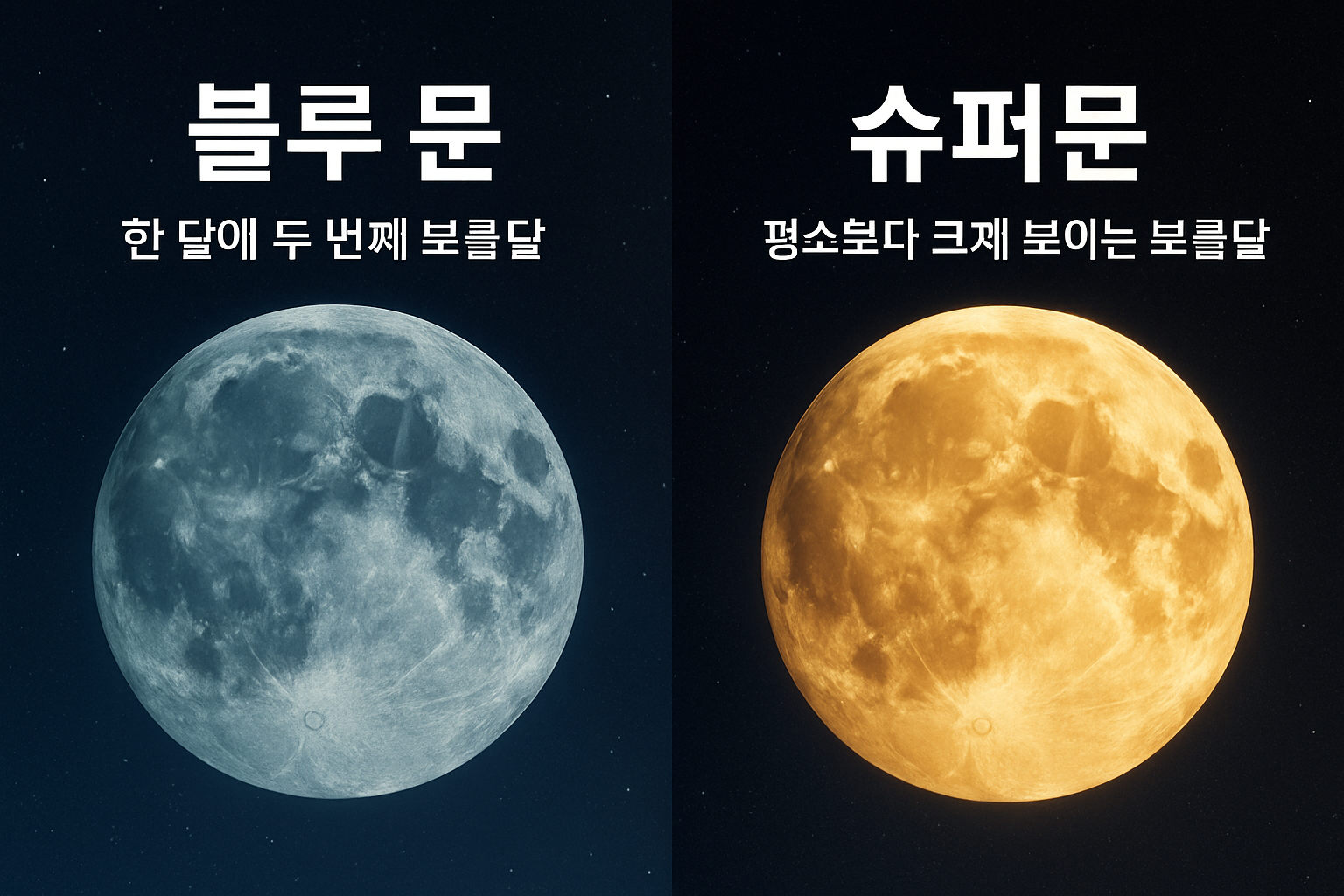 하늘을 올려다보며 유난히 크고 밝아 보이는 달을 본 적이 있거나, ‘이번 달에 두 번의 보름달이 떴다’는 소식을 들은 적이 있을 것입니다. 이때 자주 등장하는 단어가 바로 ‘블루 문’과 ‘슈퍼문’입니다. 이 둘은 종종 함께 언급되며, 같은 의미로 오해되기도 하지만 실제로는 전혀 다른 기준과 의미를 지닌 두 가지 별개의 천문 현상입니다. 블루 문은 시간상의 특수성을, 슈퍼문은 거리상의 특수성을 바탕으로 구분됩니다. 전자는 ‘언제’ 보름달이 떴느냐에 따라, 후자는 ‘얼마나 가까이에서’ 떴느냐에 따라 정의됩니다. 이처럼 두 현상은 모두 자연이 만들어낸 보기 드문 달의 모습이지만, 과학적 배경은 다르며, 사람들이 이를 바라보는 문화적 해석 또한 다양합니다. 이번 글에서는 블루 문과 슈퍼문의 정확한 정의와 차이, 그리고 이 현상들이 주는 시각적·상징적 의미를 함께 탐색해 봅니다.